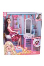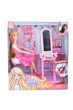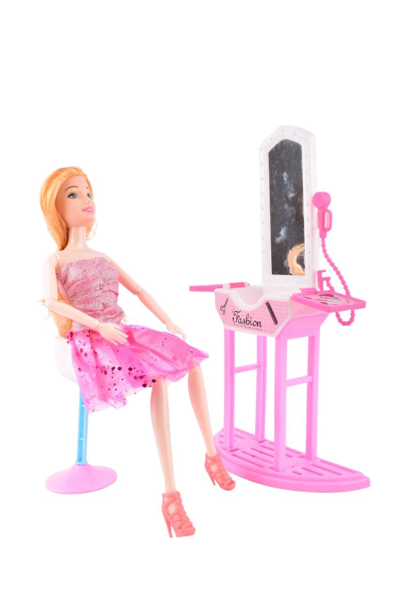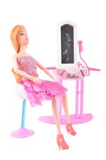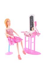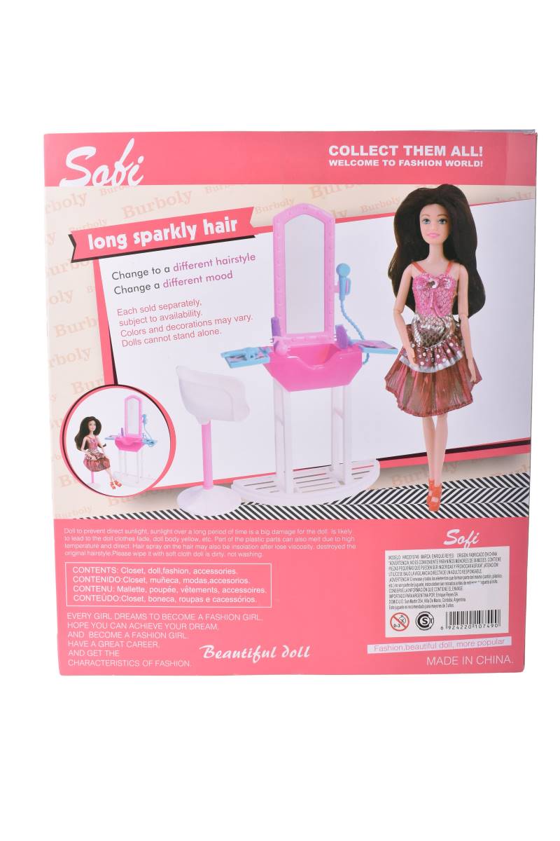 Contiene: 1 muñeca Sofi, 1 silla de salón, 1 tocador con espejo, accesorios de peluquería (secador de pelo, tijeras, cepillos).