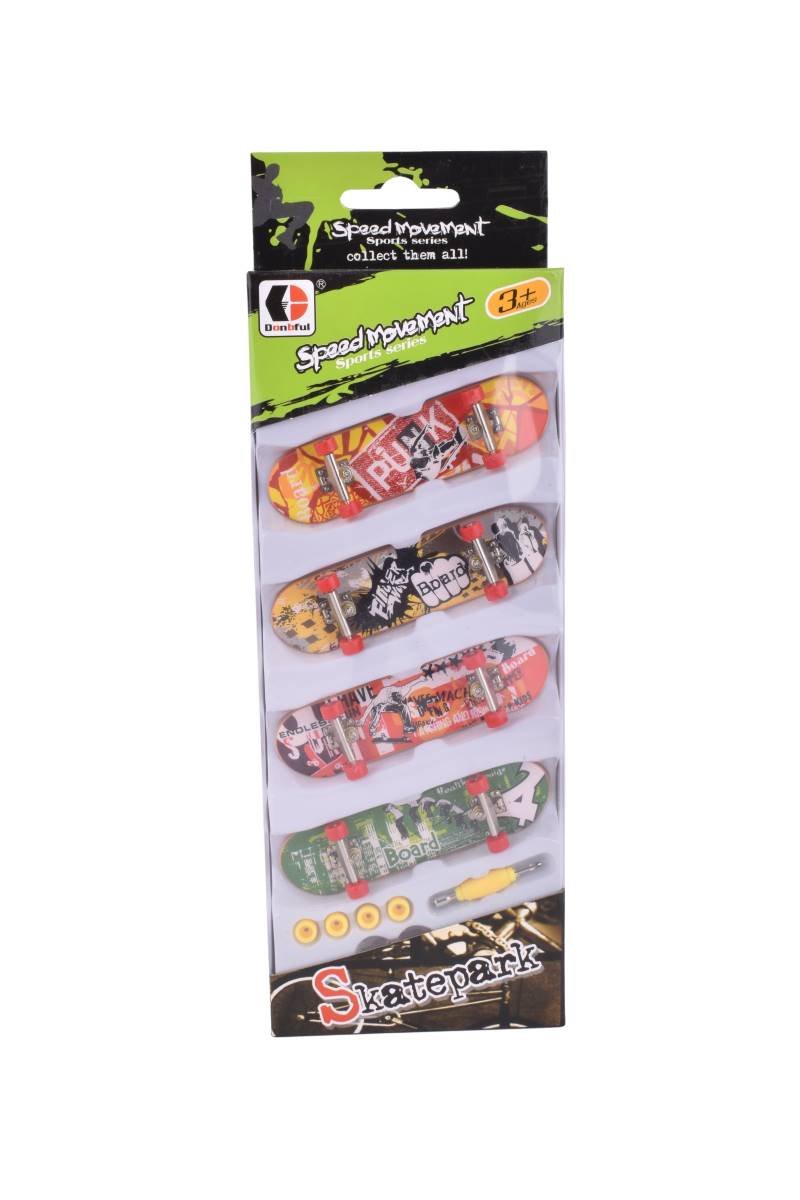 Set de 4 mini skates de dedo "Skatepark" con herramienta y diseños variados. Piezas die-cast para durabilidad. ¡Colecciona y haz trucos con tus dedos!