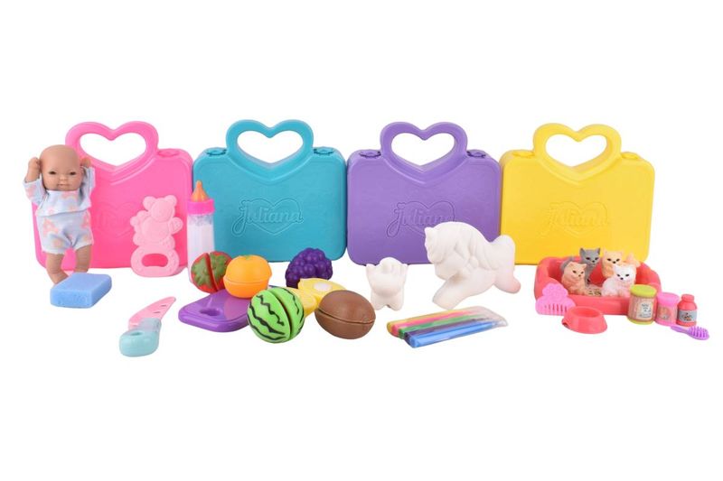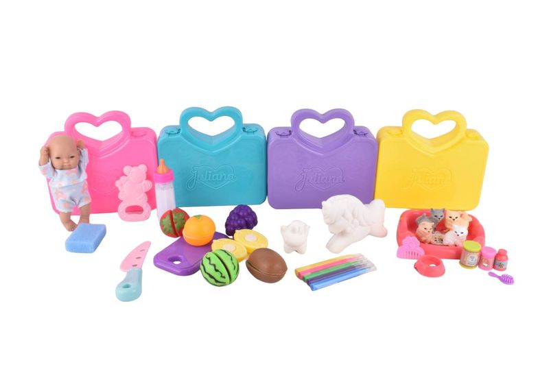 Descubrí la diversión sorpresa con la valija Juliana Sorpresas. Cada valija de plástico resistente y tamaño compacto contiene un juguete sorpresa: puede ser un bebé con mamadera, figuras de frutas y verduras, o incluso un personaje para pintar. Ideal para que los niños y niñas disfruten de momentos de juego y creatividad en cualquier lugar.