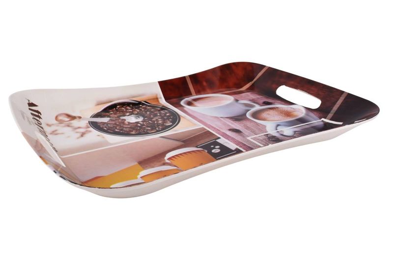 Bandeja plástica rectangular con diseño decorativo, ideal para servir desayunos, meriendas o transportar alimentos y objetos con comodidad. Ideal para servir café, té, desayunos y meriendas, o para uso doméstico en cocina, comedor o living. También apta para bares, oficinas o desayunos en cama.