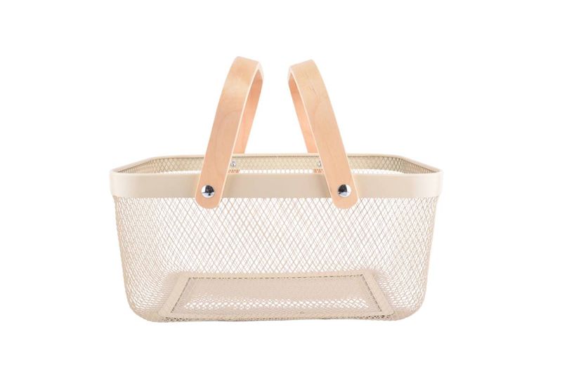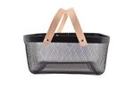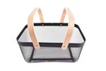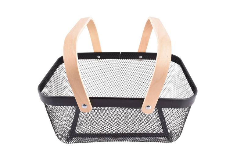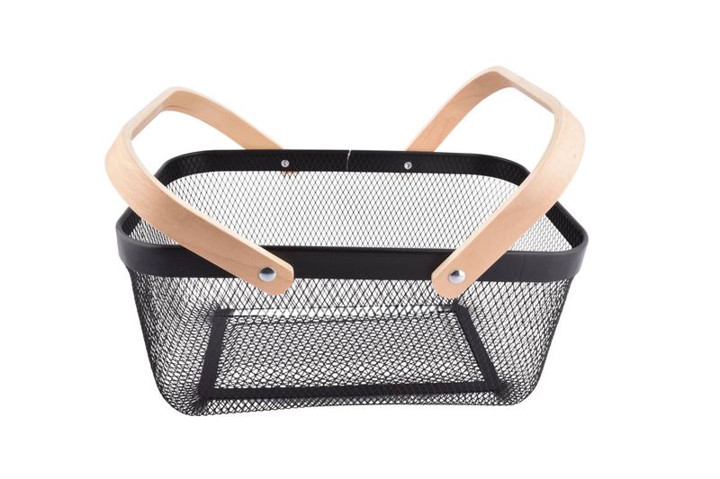 Organiza con estilo usando nuestro canasto rectangular de metal negro y mango de madera. Medidas 37x24x17cm. Ideal para el hogar, cocina o decoración.