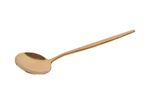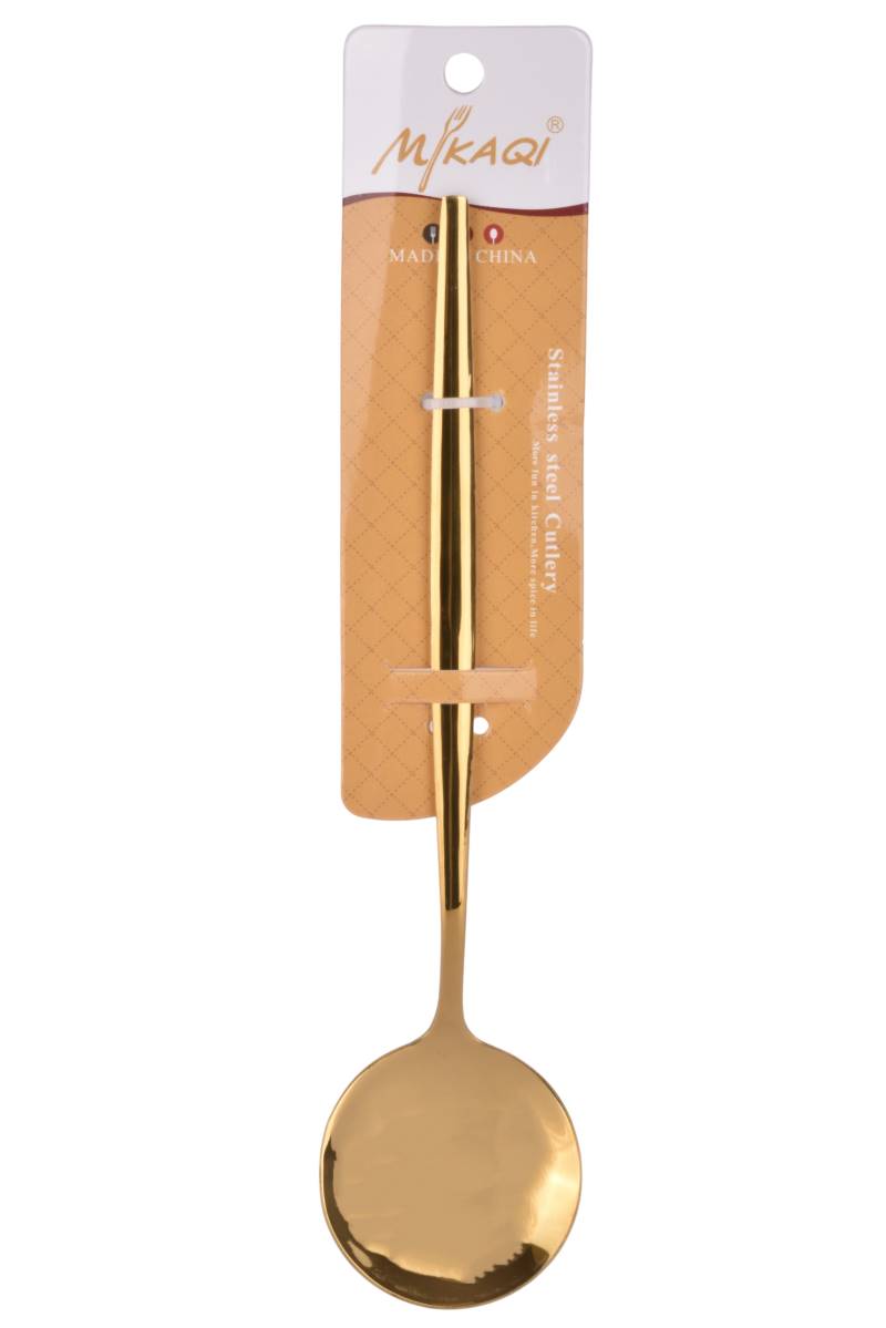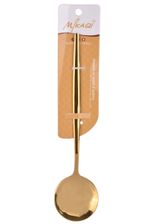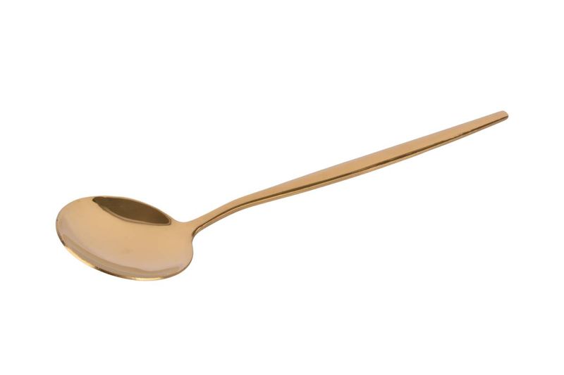 Cuchara de acero inoxidable con acabado dorado, ideal para servir y consumir alimentos con un toque elegante en la mesa. Indicada para uso diario o presentaciones especiales, apta para servir comidas, postres o acompañar vajilla decorativa.