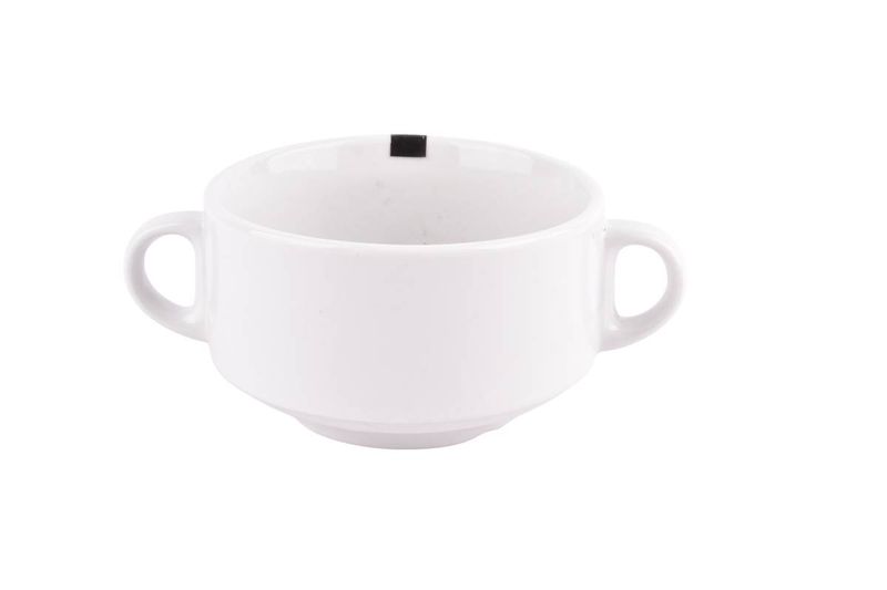 Jarro consomé apilable blanco de 15 cm, ideal para sopas y caldos. Diseño práctico con doble asa para uso diario. Cómpralo en Ferniplast.com