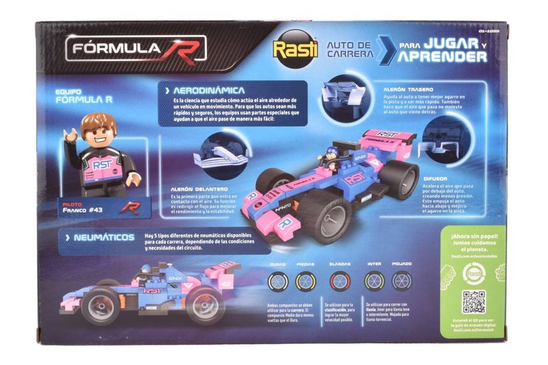 Construye el Auto F1 Rasti Fórmula R de 105 piezas con piloto y stickers. Diseño aerodinámico y juego STEM para velocidad y aprendizaje. ¡Cómpralo en Ferniplast.com!