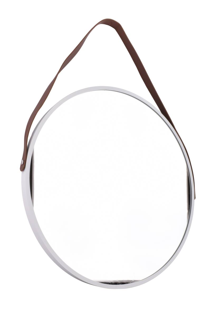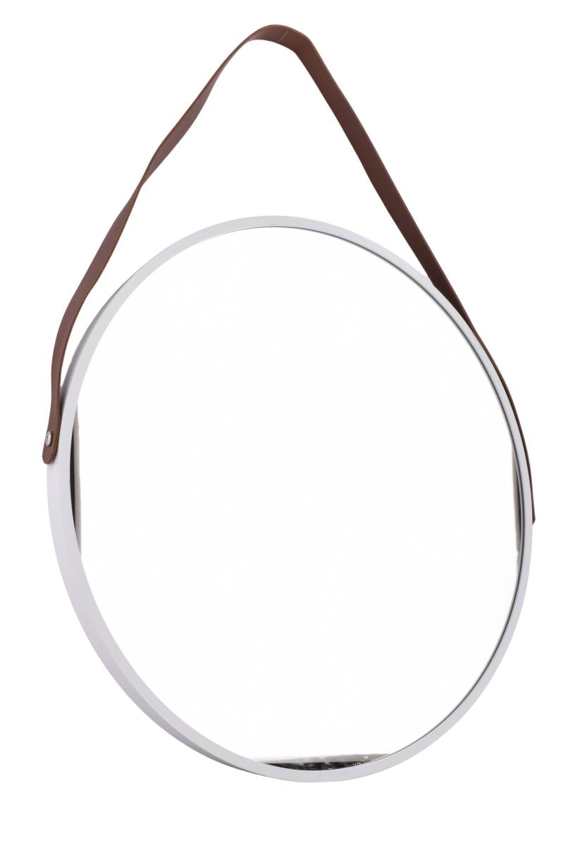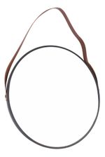 Espejo decorativo circular de 50 cm de diámetro con un elegante marco y sistema de colgado mediante una tira de cuerina, ideal para modernizar y aportar amplitud visual a cualquier ambiente.