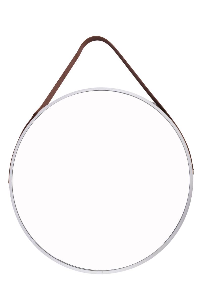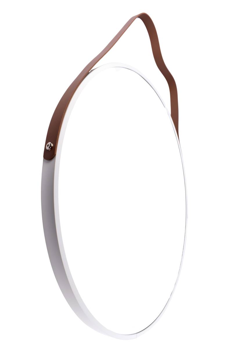 Espejo redondo de 60cm con elegante tira de cuerina para colgar. Diseño moderno que amplía tus espacios y decora. Cómpralo en Ferniplast.com