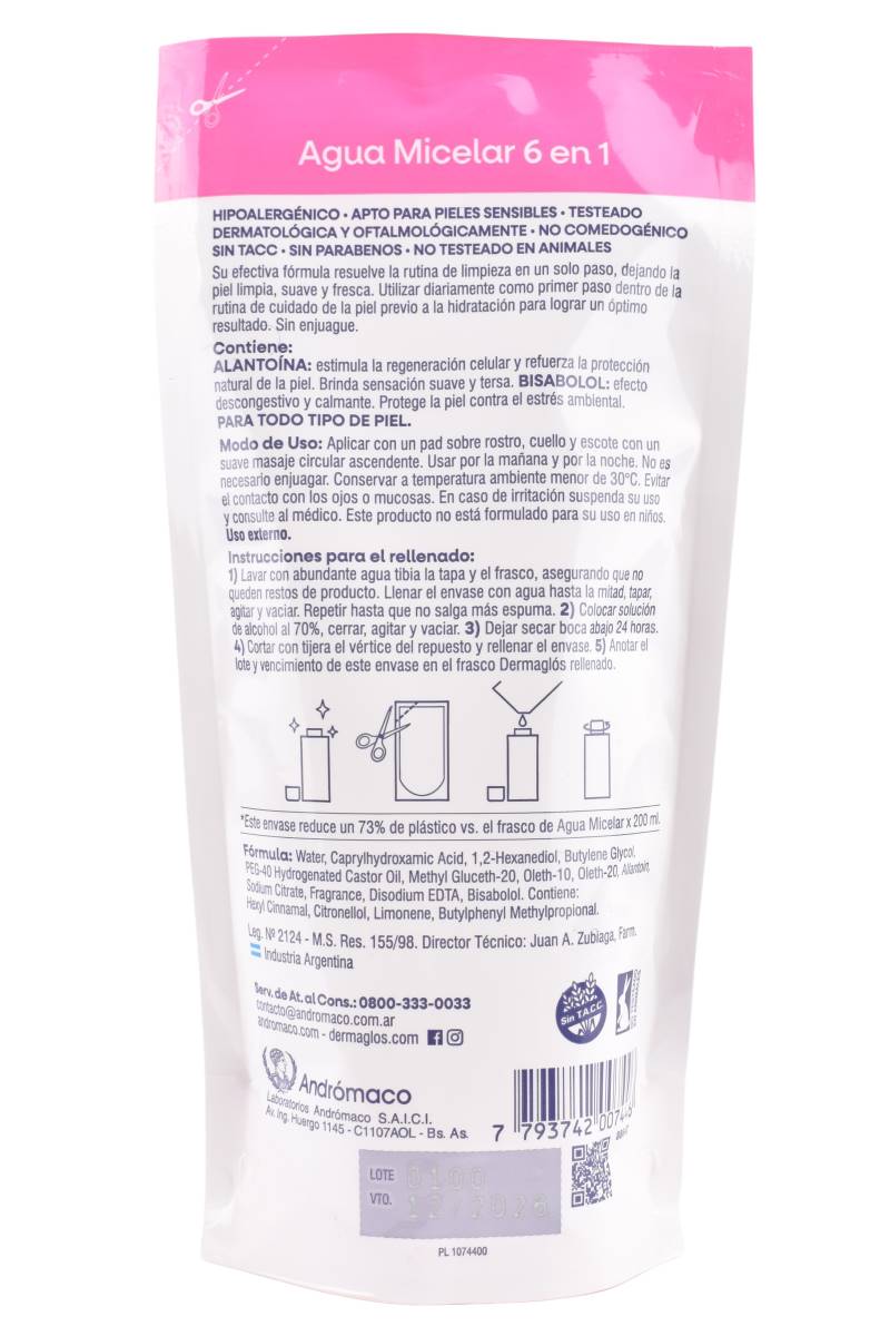 El agua micelar Dermaglos refill de 200 ml es ideal para limpiar y desmaquillar tu piel de forma suave y efectiva. Su fórmula libre de alcohol elimina impurezas y restos de maquillaje sin irritar, dejando la piel fresca, hidratada y lista para el cuidado diario.