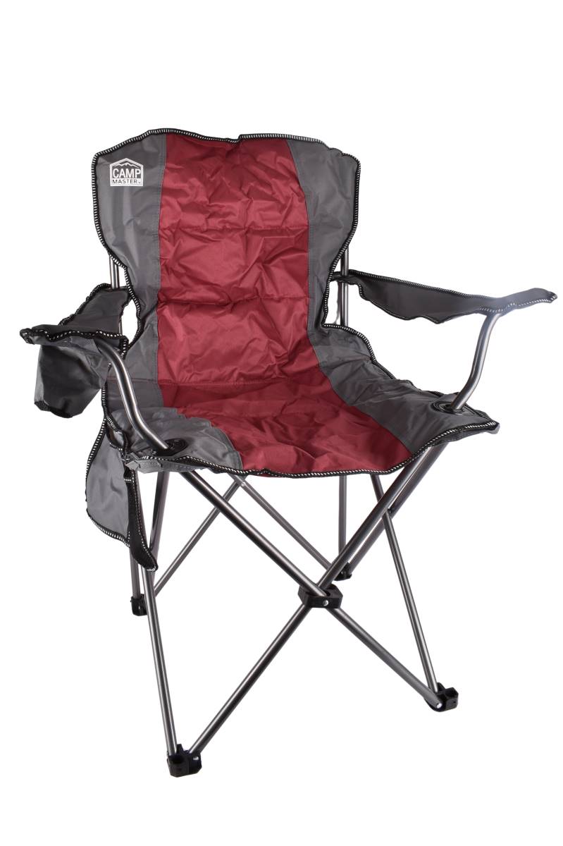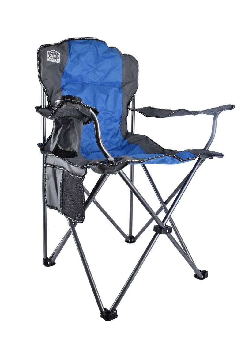 Disfruta del aire libre con la máxima comodidad. Esta silla de camping Camp Master es resistente, fácil de transportar y cuenta con un práctico portavasos integrado. Perfecta para la playa, pesca o eventos al aire libre.