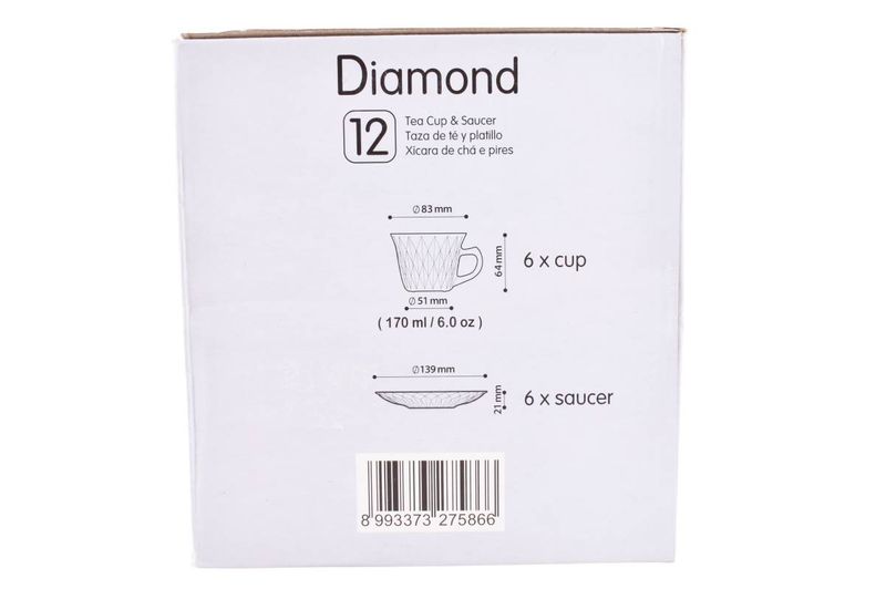 Elegancia y funcionalidad se combinan en el set Diamond de 12 piezas, que incluye tazas y platos a juego. Perfecto para disfrutar de cafés, tés o infusiones, su diseño sofisticado aporta un toque moderno a tu mesa, ideal tanto para uso diario como para recibir invitados.