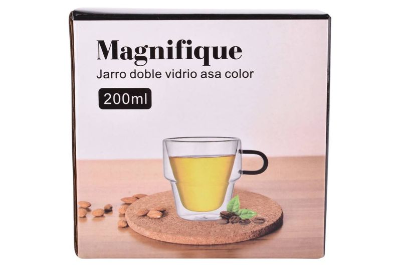 Disfrutá de tus bebidas favoritas con estilo en este jarro de doble vidrio con asa negra. Su capacidad de 200 ml es perfecta para cafés, tés o jugos, mientras que el diseño de doble pared mantiene la temperatura de la bebida por más tiempo y protege tus manos del calor. Elegante y funcional para uso diario o para recibir invitados.