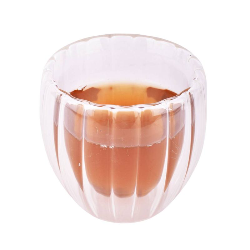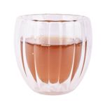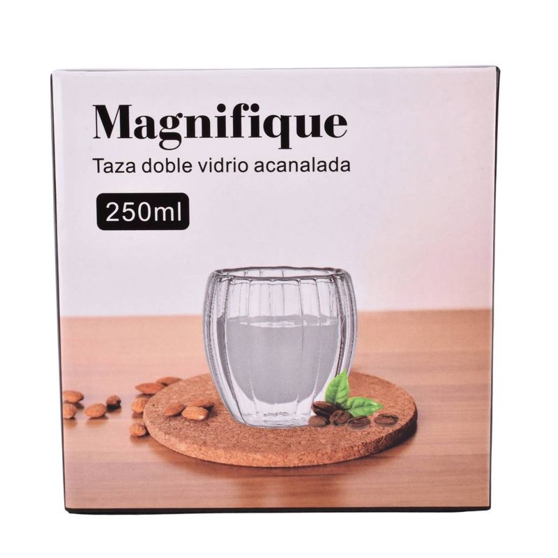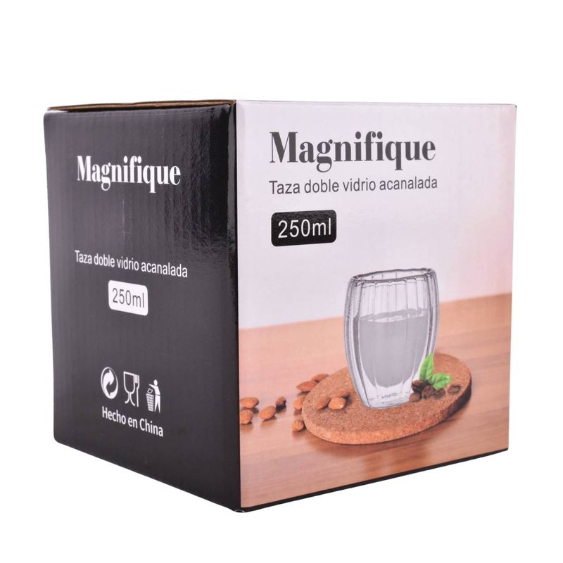 Elegancia y funcionalidad se combinan en esta taza doble de vidrio sin asa, con diseño acanalado que realza su estilo moderno. Su doble pared mantiene tu bebida caliente por más tiempo sin quemarte las manos, ideal para café, té o infusiones.