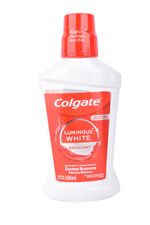 El enjuague bucal Colgate Luminous White de 500ml ayuda a mantener una sonrisa más blanca y brillante mientras combate las bacterias que causan el mal aliento. Su fórmula especial contribuye a remover manchas superficiales y deja una sensación de frescura prolongada en la boca. Ideal para complementar tu rutina de higiene oral diaria.