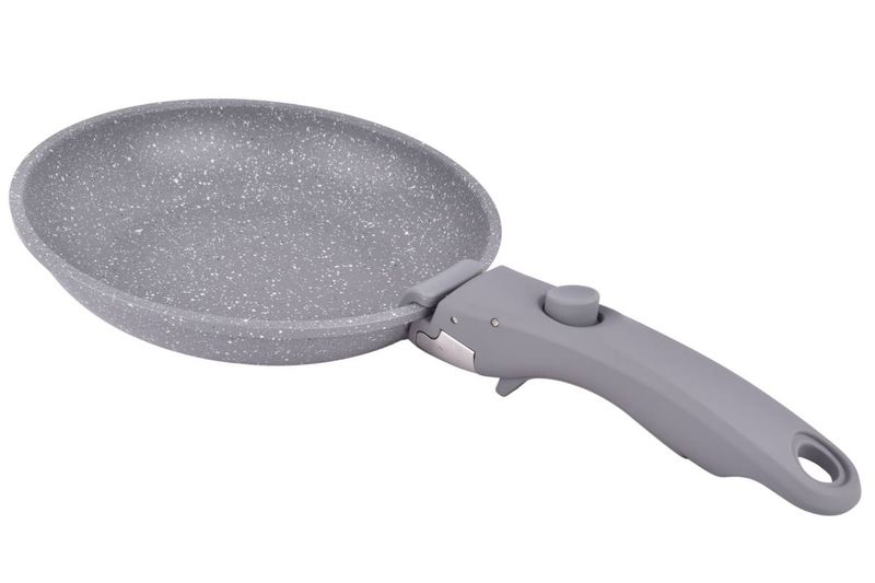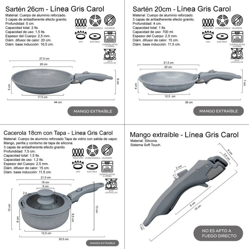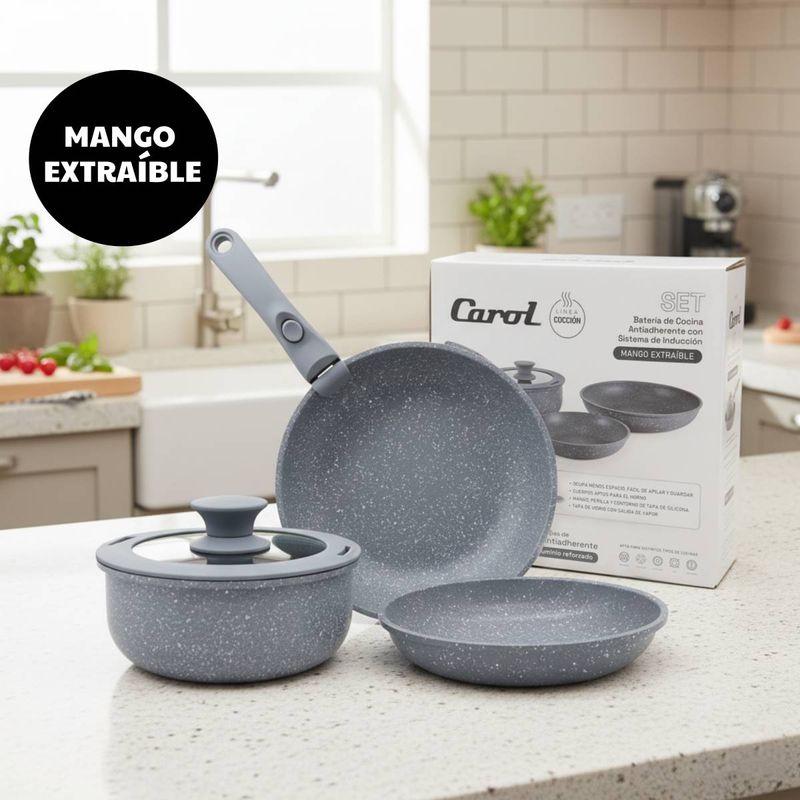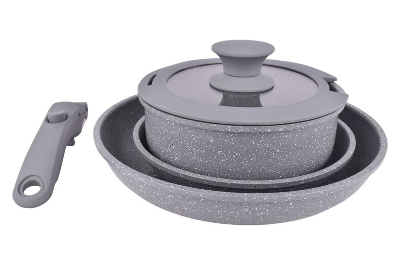 Batería de cocina Carol Gris 5 en 1 con mango extraíble. Apta inducción y horno. Diseño apilable. Cómpralo en Ferniplast.com