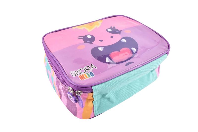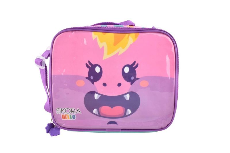 Lunchera Gloombies Hello con diseño infantil y colores vibrantes, ideal para llevar viandas, meriendas o snacks de manera práctica. Su tamaño compacto permite un transporte cómodo para el uso escolar o salidas diarias. Cuenta con cierre superior para un acceso simple y formato liviano, fácil de manipular por niños.