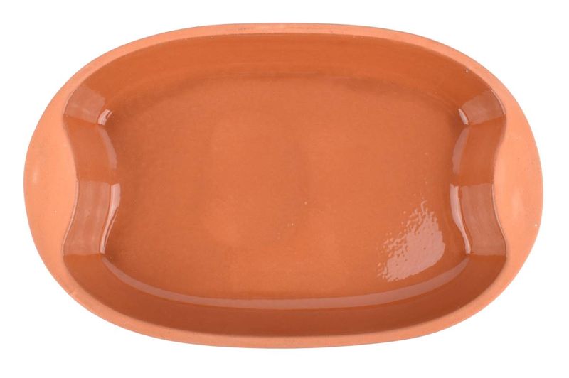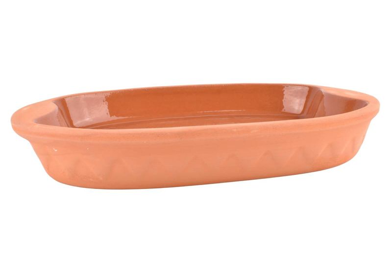 Esta fuente oval de terracota de 30x21cm es el recipiente ideal para hornear, gratinar y presentar grandes porciones de comidas. El material de barro garantiza una cocción uniforme y mantiene tus platos calientes en la mesa.