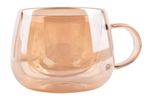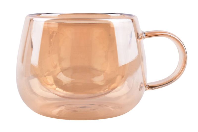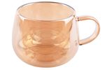 Taza de vidrio de 200 ml con doble pared y acabado color ámbar, ideal para bebidas calientes manteniendo una temperatura más estable. Uso para café, té, infusiones o bebidas calientes en el hogar u oficina.
