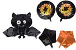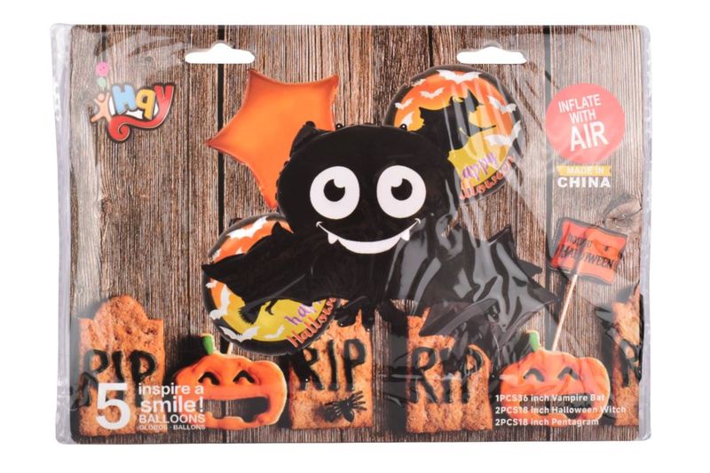 Set de 5 globos de Halloween metalizados: Murciélago gigante, estrellas y estampados. Decoración durable y de impacto. Cómpralo en Ferniplast.com