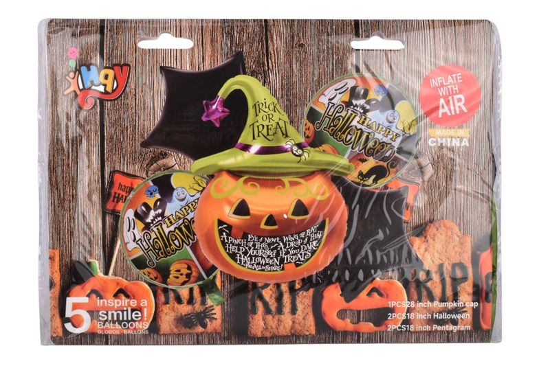 Decora tu evento con este set de 5 globos metalizados de Halloween, que incluye una calabaza gigante con sombrero de bruja, ideal para crear un ambiente festivo y escalofriante.