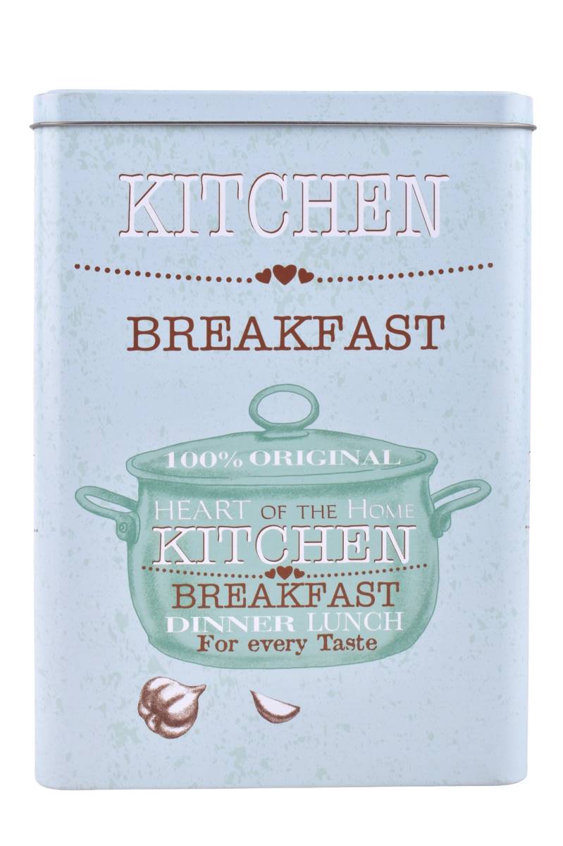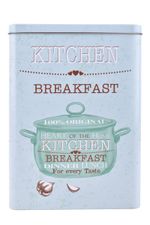 Lata metálica rectangular con tapa, ideal para almacenar alimentos secos como galletas, café, té, azúcar o cereales. Su formato práctico permite optimizar espacio en alacenas y estantes, mientras que el diseño decorativo la convierte en un accesorio funcional para la cocina o despensa de uso diario.