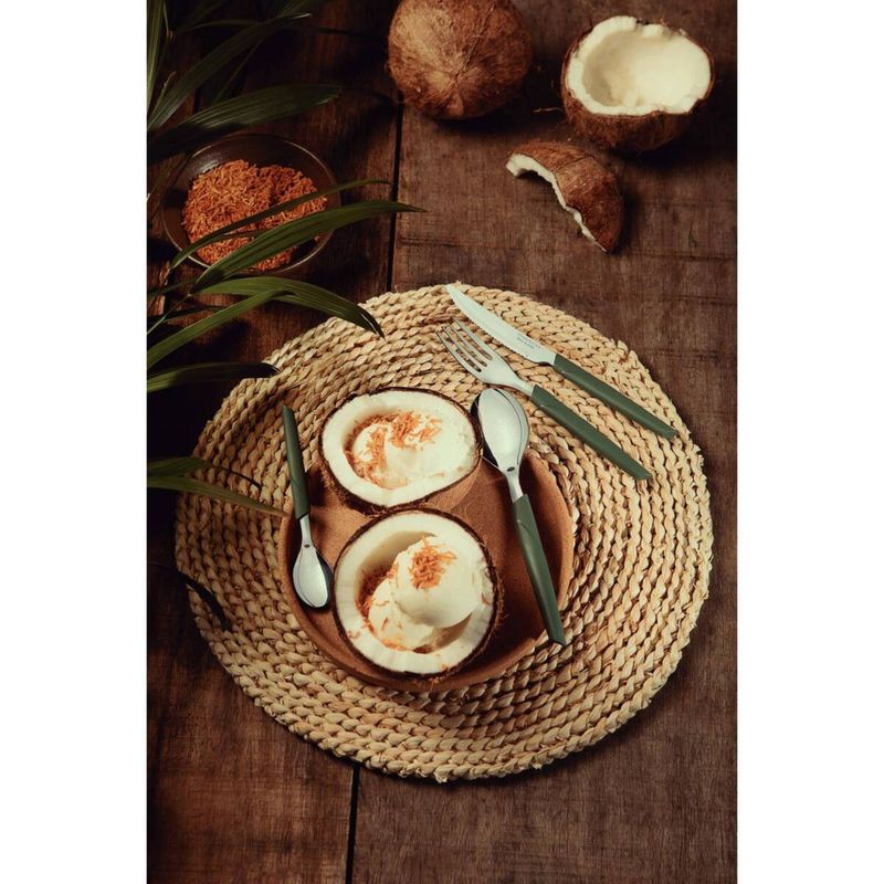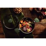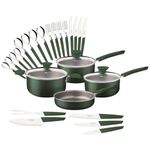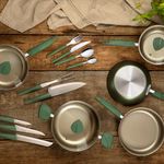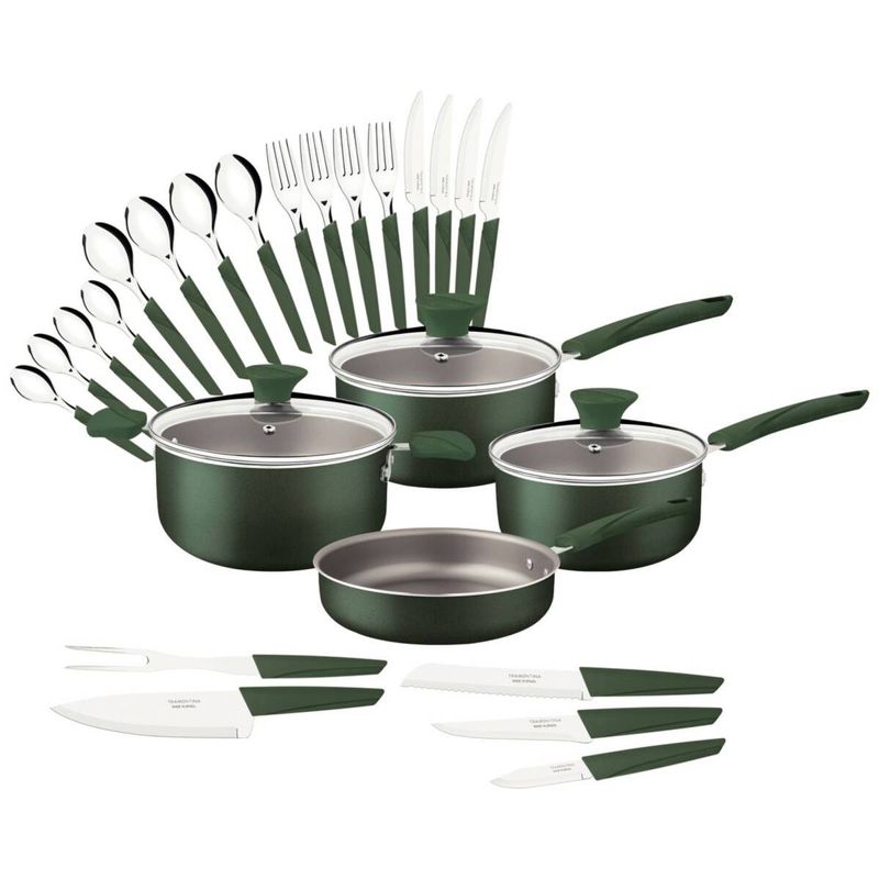 Lo que necesita para completar su cocina está presente en el batería de cocina Tramontina Lyf verde naturaleza de 25 piezas. Ideal para quienes aprecian la sustentabilidad, sus piezas de cocina están desarrolladas con un cuerpo de aluminio con revestimiento interno y externo de antiadherente Starflon Max, un material que no se pega y es muy fácil de limpiar. Los mangos, asas y agarradores son de polímero 100 % reciclable, un material que ofrece seguridad y permite un manejo mucho más confortable. El kit de cocina también incluye cuchillos para preparar los alimentos y cubiertos que le acompañarán en las principales comidas. Toda la línea es 100 % reciclable y mantiene el concepto de que la sustentabilidad es un ciclo. Tramontina presenta una línea fluida, que se inspira en las hojas y en el viento. ¡Tramontina LYF: la elección más sustentable para su cocina!