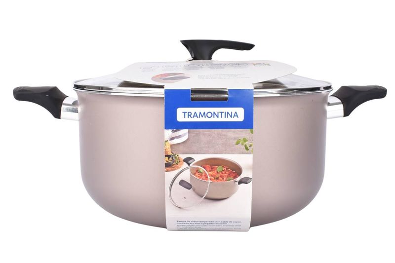 Cacerola Tramontina Milazzo de 28 cm con tapa de vidrio, pensada para cocinar grandes preparaciones con control visual y manejo seguro. Ideal para guisos, pastas, sopas y comidas abundantes, permitiendo una cocción pareja y cómoda para el uso diario.