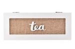 Elegante caja de almacenamiento para bolsitas de té, con diseño decorativo en color blanco y una ventana frontal de arpillera con la palabra "tea" en relieve. Perfecta para mantener tus infusiones organizadas.