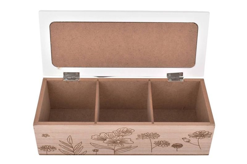 Caja Decorativa para Té blanca (24 cm) con 3 divisiones y diseño rústico de arpillera. Organiza tus infusiones con estilo. ¡Cómprala en Ferniplast.com!
