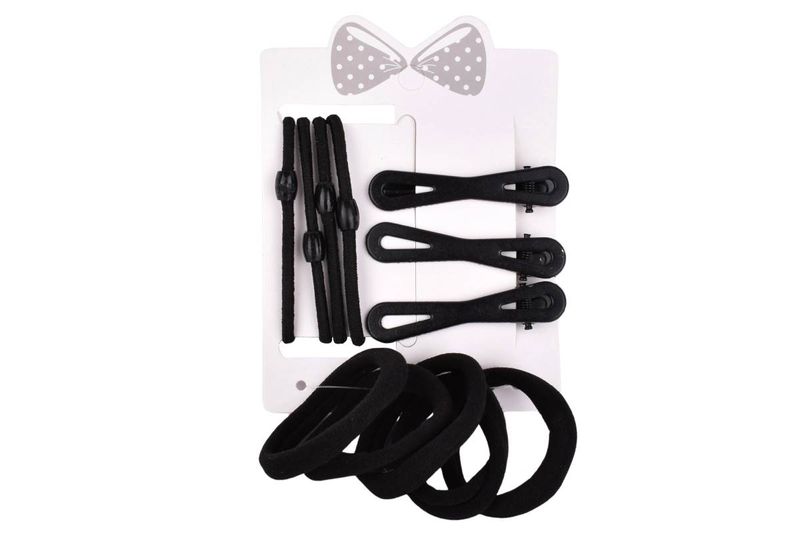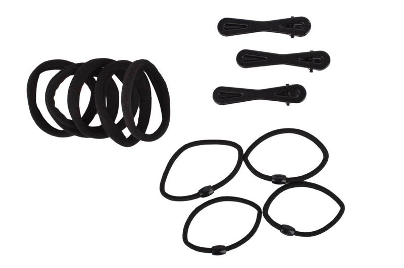Set práctico con prensas, gomitas y elásticos negros. Ideal para peinados diarios y mantener el cabello siempre ordenado. Perfecto para sujetar, dividir y estilizar el cabello en peinados simples o más elaborados, tanto para uso diario como escolar o deportivo.