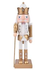 Figura decorativa de cascanueces en tonos dorados y blancos, ideal para sumar un toque clásico y elegante a tu ambientación navideña. Perfecto para decorar entradas, mesas, chimeneas, vitrinas, armar rincones temáticos o complementar colecciones navideñas.