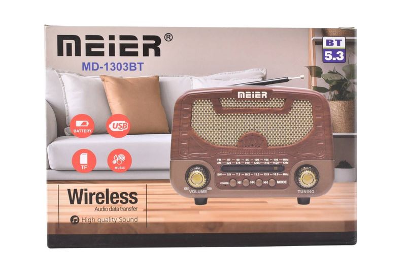 Parlante Radio Meier MD-1303BT Vintage. Diseño retro, Bluetooth 5.3, y 3 Bandas (FM/AM/SW). Con USB, TF y AUX. Sonido de alta calidad. Cómpralo en Ferniplast.com.