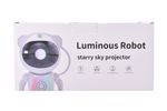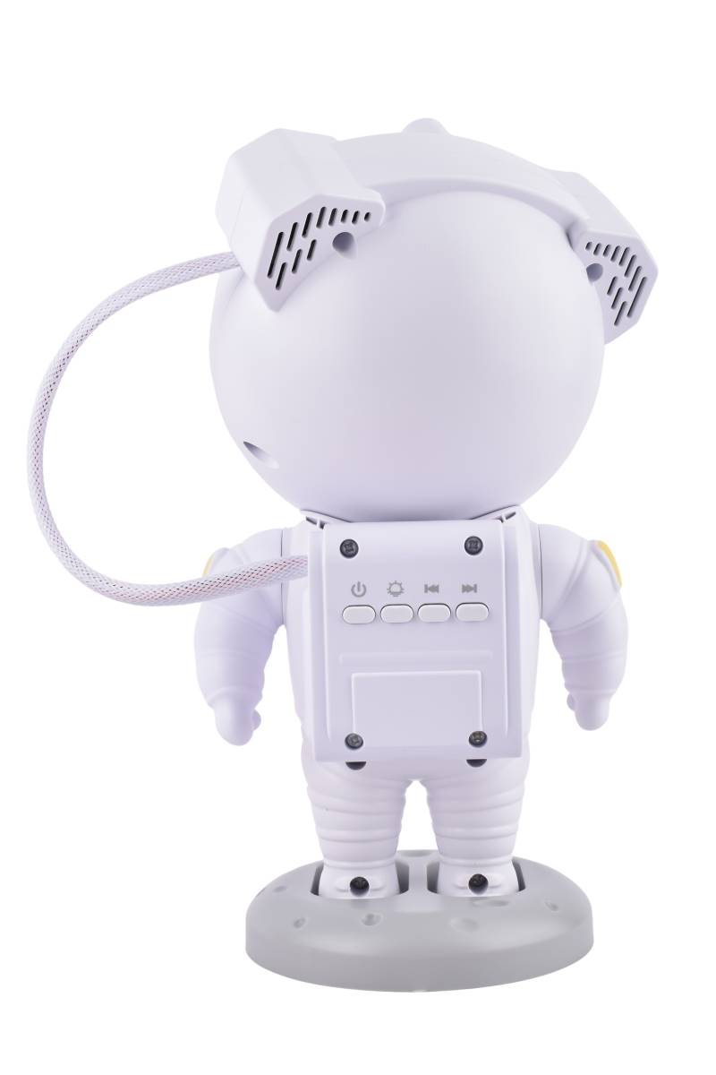 Proyector en forma de astronauta que ilumina el techo con galaxias de colores y parlante incorporado para música ambiente.