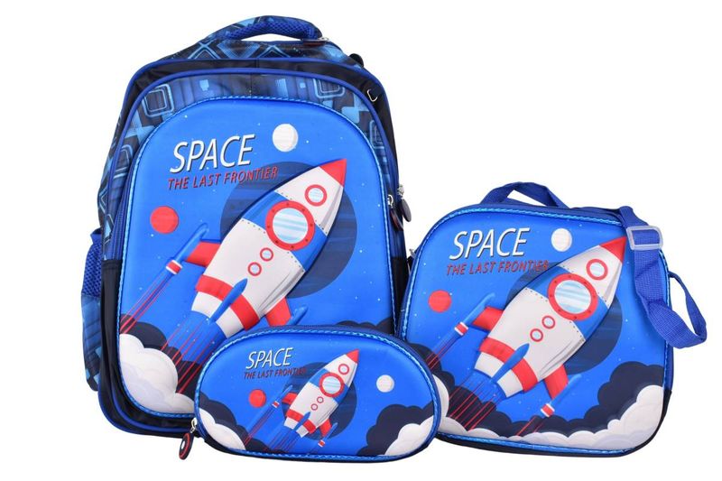 Set escolar infantil de 3 piezas con diseño espacial 3D, ideal para nivel inicial y primaria. Funcional, resistente y coordinado para el uso diario. Pensado para el uso escolar diario, permite transportar útiles, alimentos y accesorios de forma organizada y cómoda, tanto en la escuela como en salidas.