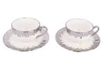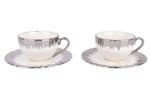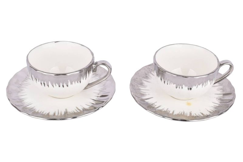 Set de tazas y platos de cerámica 8 piezas con acabado plateado. Elegantes, resistentes e ideales para café o té. Llévalo ahora en Ferniplast.com.