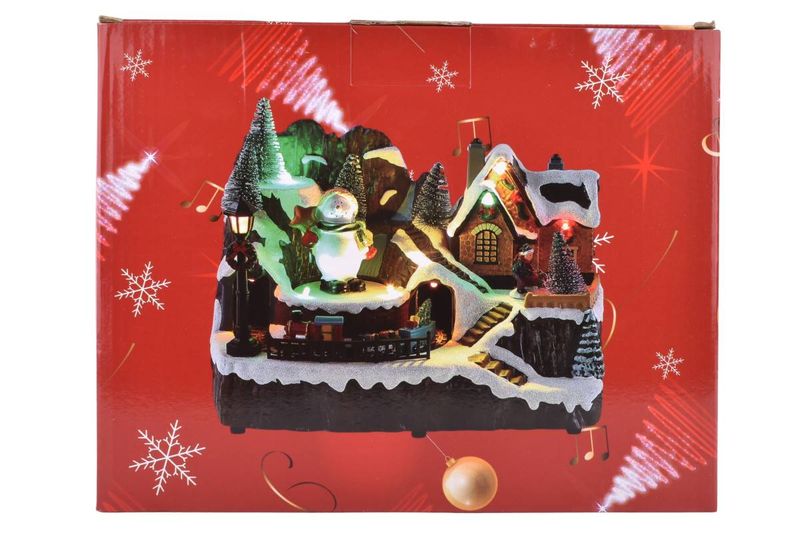 Aldea navideña con tren y muñeco móvil, luces y doble alimentación USB/pilas. Ideal para decorar tu hogar esta Navidad. Cómprala en Ferniplast.com.