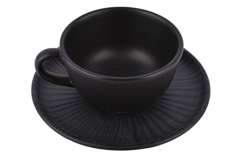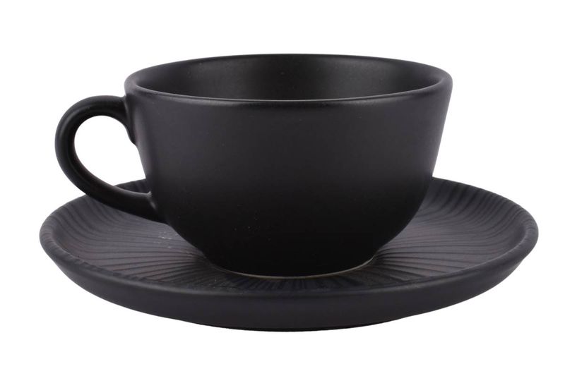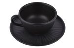 Set de taza de té con plato en color negro ónix, ideal para servir infusiones con un estilo moderno y elegante. Indicada para servir té, infusiones o café suave en desayunos, meriendas o servicios de mesa formales e informales.