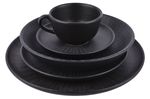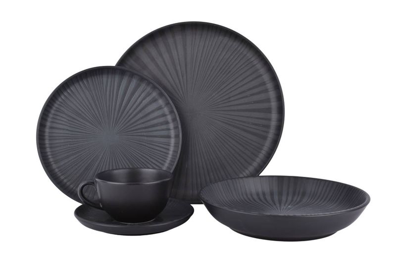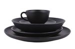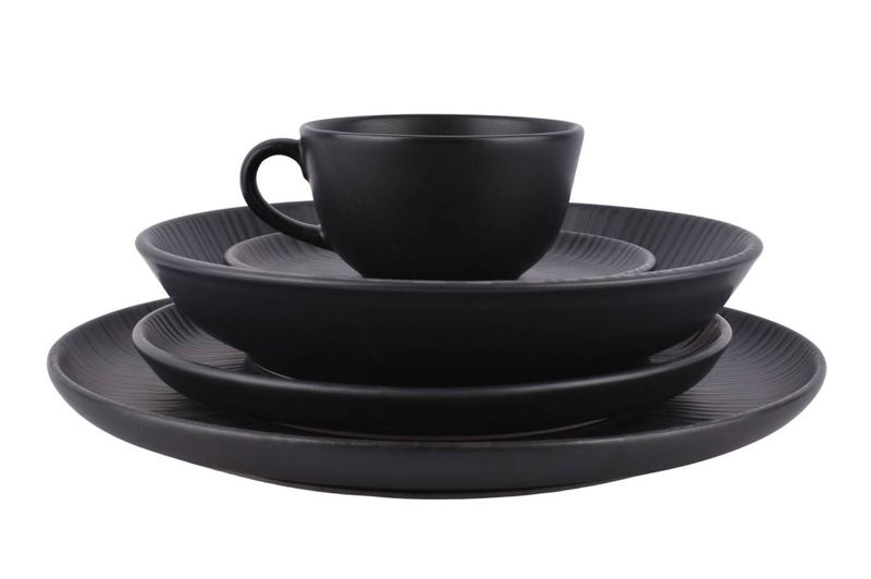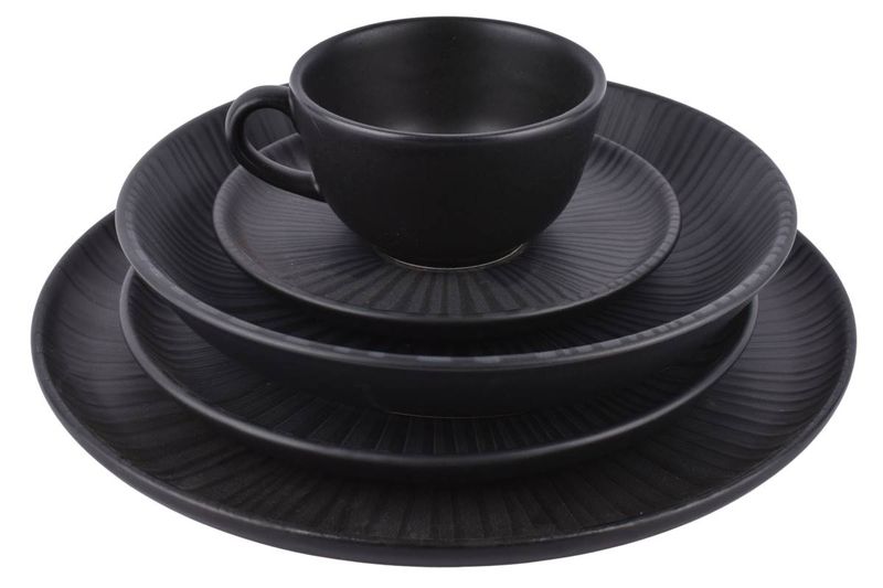 Vajilla completa de cerámica en tono negro ónix con textura sutil, ideal para mesas modernas y uso diario o especial. Pensada para equipar la mesa diaria o para ocasiones especiales, ofreciendo una presentación elegante para comidas y bebidas calientes.