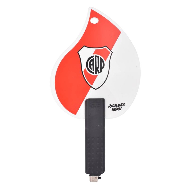 Práctico accesorio doble función para el asado: un avivador de fuego (apantasador) con diseño temático de River Plate y un mango que integra un encendedor recargable.