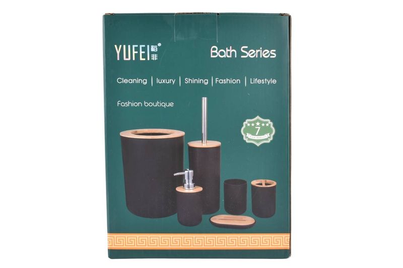 Set completo de 6 accesorios de baño con un diseño moderno y lujoso, combinando un cuerpo negro sólido con detalles de imitación madera para un estilo elegante y funcional. Este set unifica y organiza todos los elementos esenciales de higiene del baño bajo una misma línea de diseño, transformando la decoración del espacio con un toque de lujo y moda.