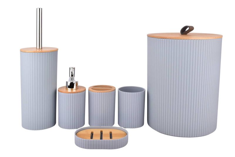 Set de baño 6 piezas gris con detalles en bambú. Elegí orden y estilo para tu baño. ¡Compralo online en Ferniplast.com!