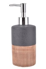Eleva la estética de tu baño o cocina con este elegante dispenser de jabón líquido. Su diseño combina la cerámica texturada en gris con una base de acabado bronce cobrizo, añadiendo un toque moderno y sofisticado.