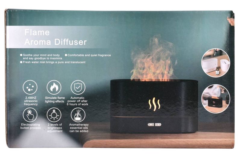 Difusor de aromas ultrasónico Flame 180ml. Crea ambiente relajante con luz LED efecto fuego y aceites esenciales. ¡Cómpralo en Ferniplast.com!