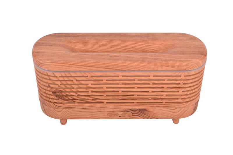 Elegante difusor de aroma y humidificador ultrasónico de sobremesa con diseño de simulación de madera, luces LED de colores y alimentación USB.