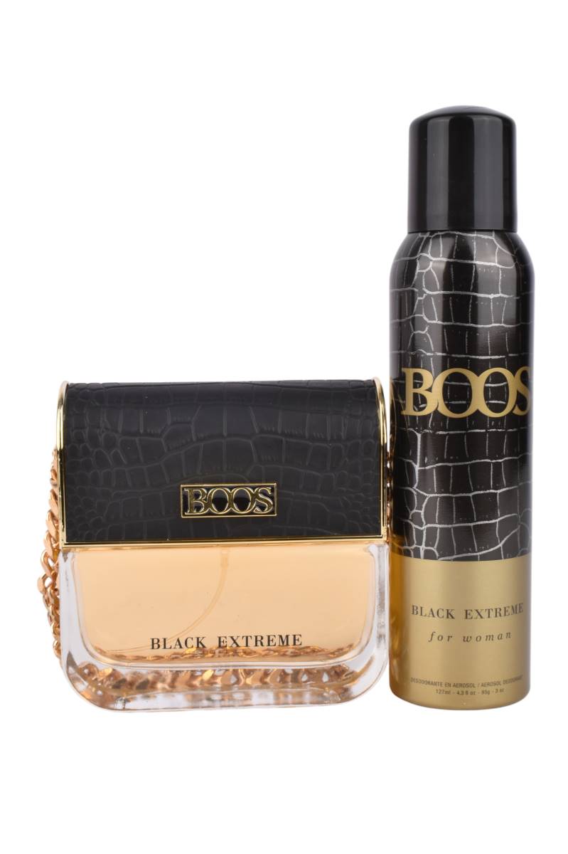 Boos Black Extreme for Woman es un set que combina eau de parfum y desodorante en aerosol para una experiencia de fragancia completa. Ideal para uso diario o salidas especiales, permite reforzar el aroma y mantener una sensación de frescura prolongada. Una opción práctica para regalar o sumar a tu rutina personal.