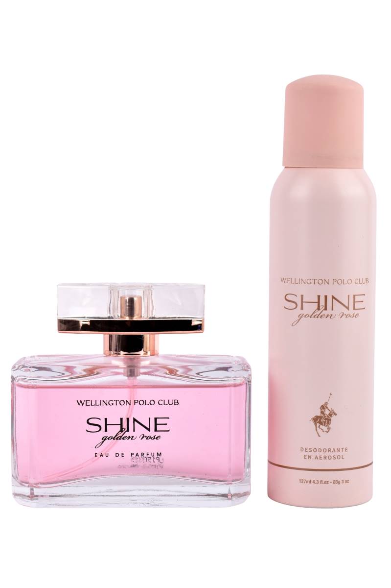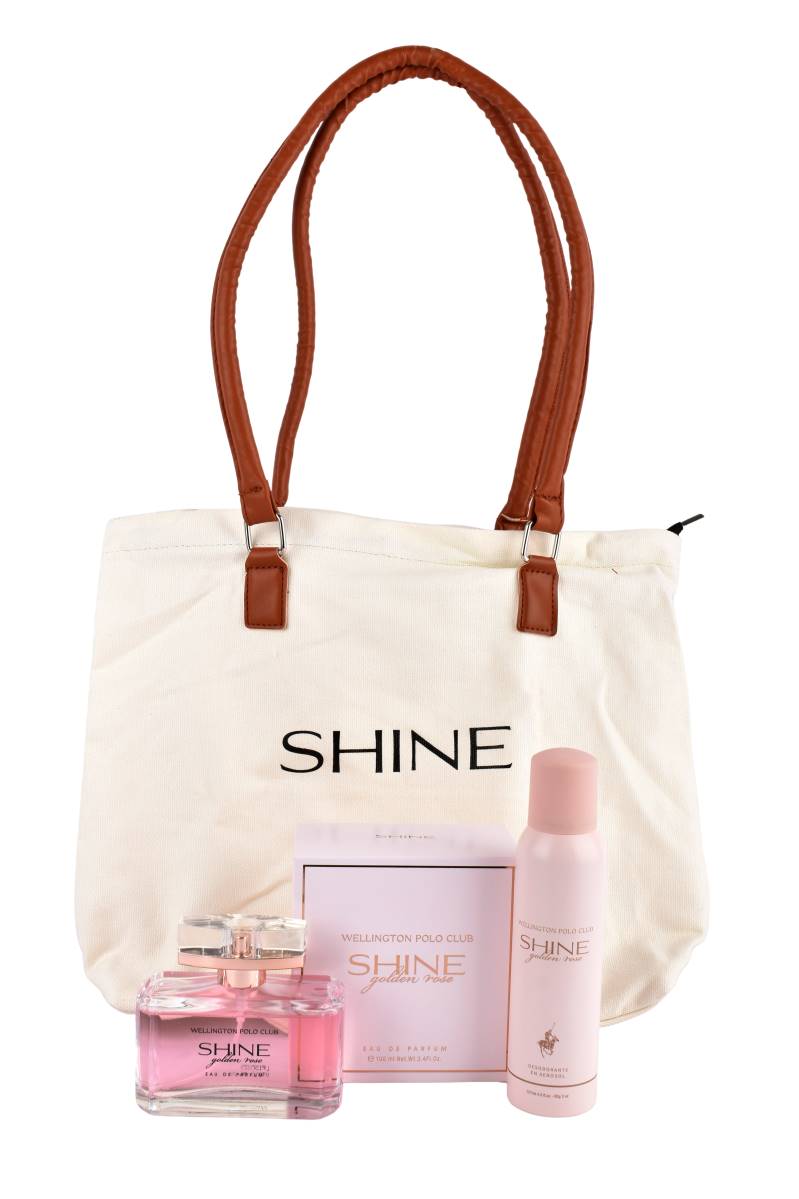 Set de perfume Shine Golden Rose Wellington Polo Club. Incluye EDP 100 ml, Desodorante y Tote Bag de regalo. ¡El obsequio perfecto! Cómpralo en Ferniplast.com.