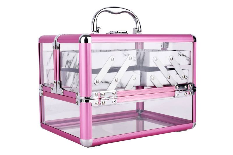 El organizador profesional que necesitas. Este maletín combina un diseño transparente que permite ver el contenido al instante con una estructura desplegable de bandejas internas con estilo mármol.