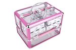 Maletín de maquillaje profesional de 25x18x18 cm. Transparente, con marco rosa y bandejas desplegables internas. ¡Organiza tus cosméticos! Cómpralo en Ferniplast.com.