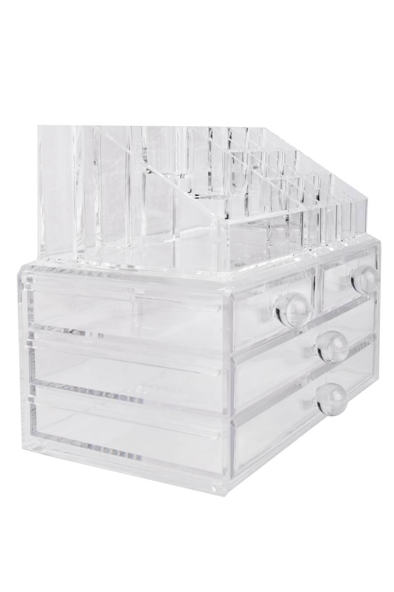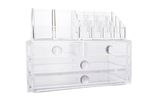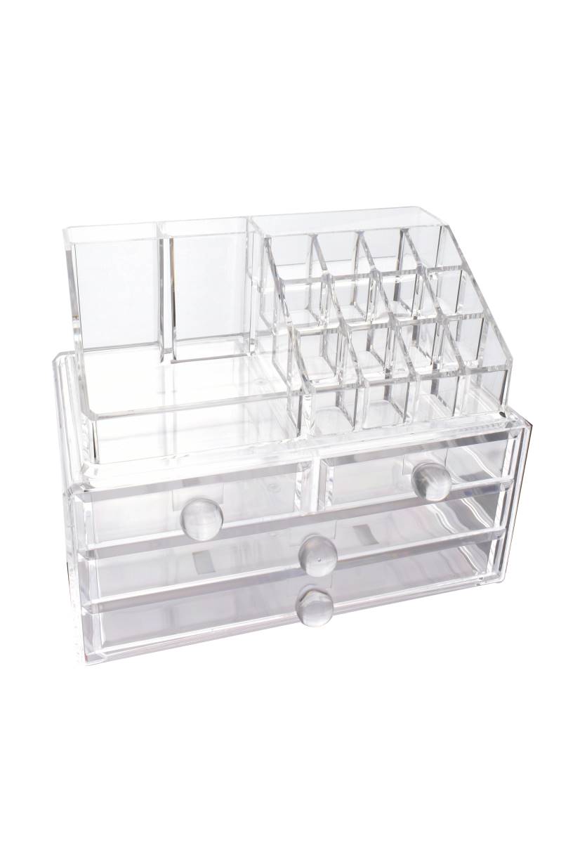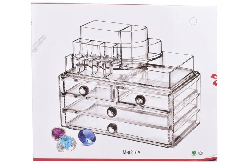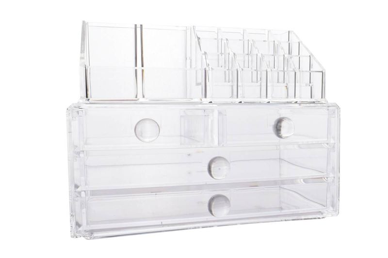 Organizador acrílico diseñado para almacenar y ordenar maquillaje, accesorios y productos de cuidado personal. Combina cajones amplios con compartimentos superiores abiertos, facilitando el acceso rápido y manteniendo todo visible y organizado. Ideal para tocadores, baños o espacios de uso diario, optimiza el espacio y aporta un look limpio y prolijo.