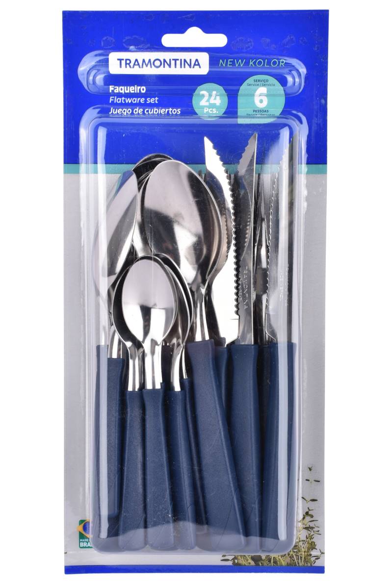 Dale estilo y practicidad a tu mesa con el juego de cubiertos Tramontina New Kolor. Su diseño moderno con mangos en color azul aporta elegancia a cualquier ocasión, mientras que el acero inoxidable de alta calidad asegura resistencia y durabilidad. Ideal para el uso diario o para recibir invitados, es un set completo y funcional que combina comodidad, calidad y fácil mantenimiento.