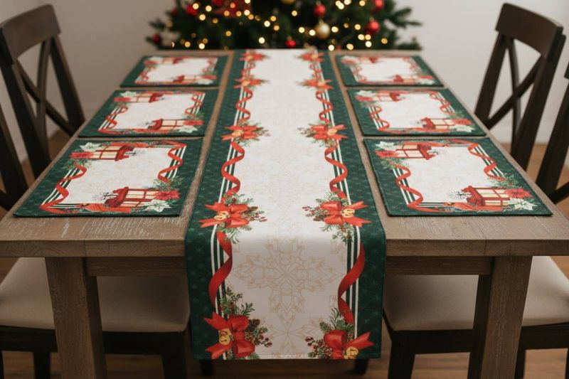 Set de mantelitos individuales y camino de mesa con diseño navideño para vestir tu mesa con estilo y armonía. Perfecto para decorar la mesa en reuniones familiares, cenas navideñas o eventos especiales, aportando color y calidez al ambiente.