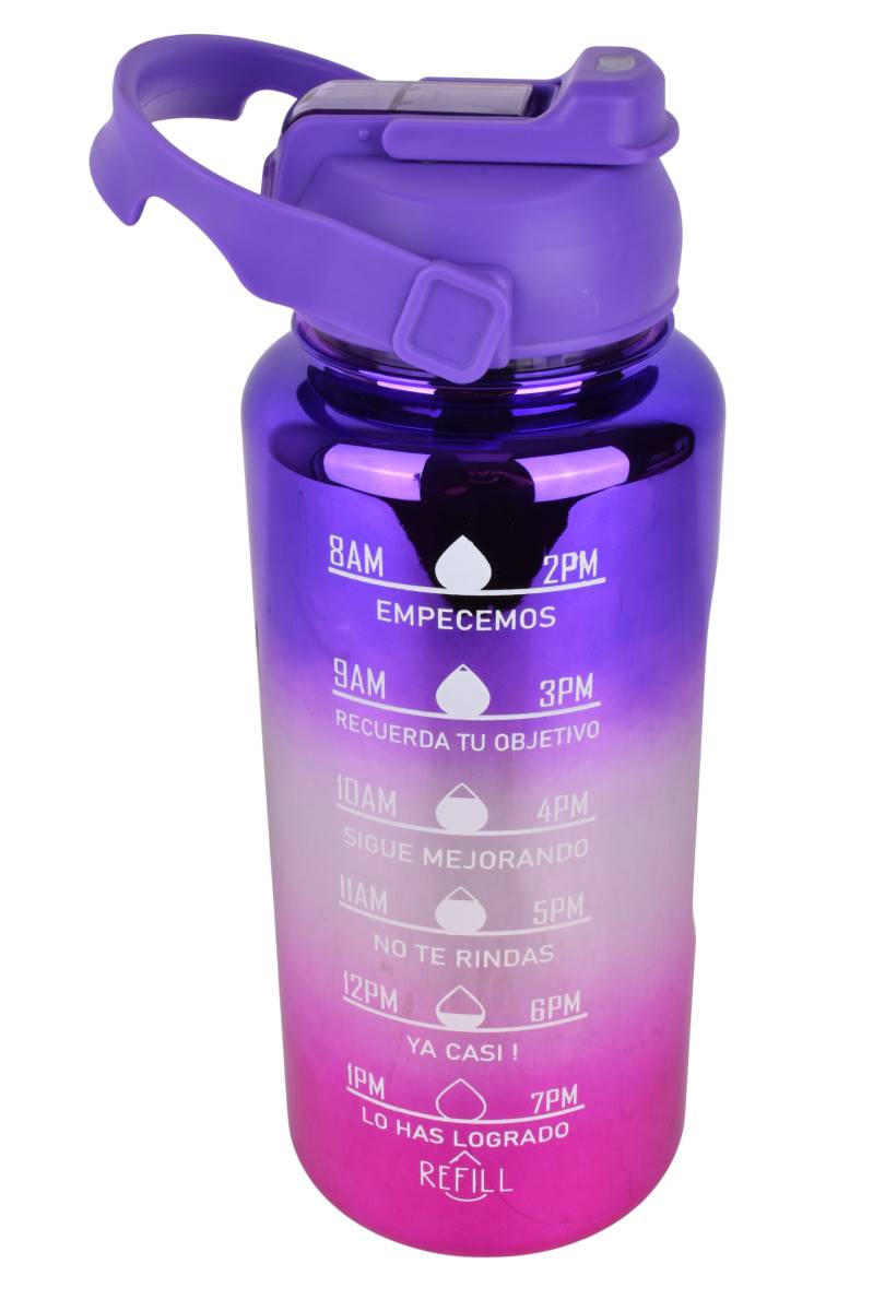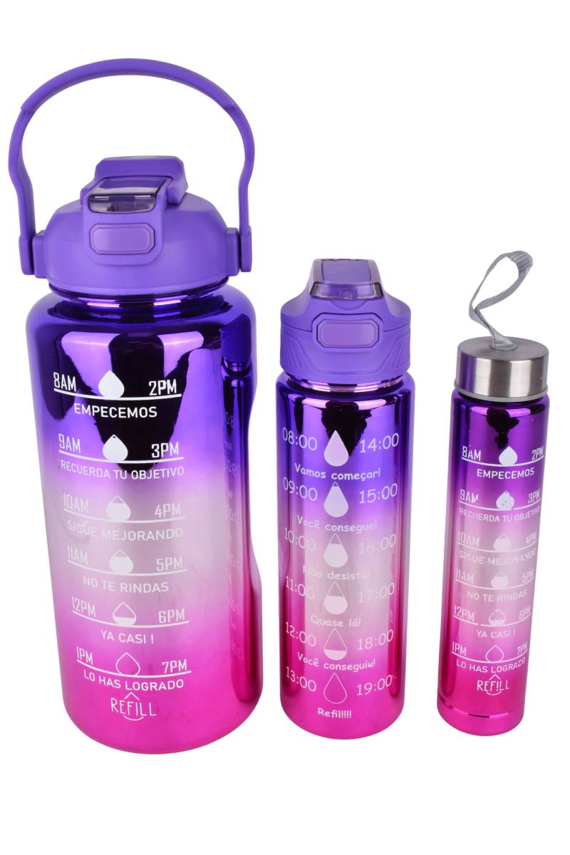 Alcanzá tus metas de hidratación con este set integral de tres botellas con diseño tornasolado y frases motivacionales. Ideal para organizar la hidratación diaria en el trabajo, gimnasio o estudio, permitiendo llevar diferentes medidas de bebida según la actividad.